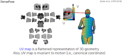 uv map은 3d를 2d 펼쳐서 이미지 형태로 만드는 기법. 3d모델로 나타낼 때 삼각형으로 나오는데 각 삼각형의 점을 keypoint로 생각하는 것 같다. 이 삼각형의 점은 위치가 한번 고정되면 평생 거기에 있으니까 가능한 기법이라는 것 같다. 1:1로 매칭이 됨. 각 mash 내에서의 삼각형이 고유의 id를 가지기 때문에 매칭이 된다. 3d가 움직여도 id mash는 고정이 되서 tracking이 됨. 보존이 됨. uv map과 3d mash와의 관계가 변하지 않음.