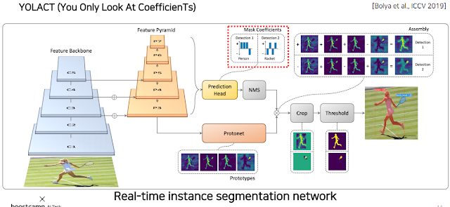 저것도 이제 two-stage라 one-stage로 만든 YOLACT가 있는데, 주목할 부분은 Protonet. 진짜 mask를 만드는게 아닌 mask를 만들수 있는 기초 component를 만듬. Prediction Head에서 물체가 어떤것인지를 파악해서 Protonet과 결합할 때 mask의 component를 만들었으니까 이 component와 mask coefficients를 곱해서 해당 부분의 value만 남기고 이걸 더하거나 빼거나 해서 mask를 만든다. 이걸 결과로 내놓으면 해당 물체에 대한 mask가 나옴.