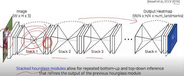 Hourglass network라고 해서 입력 이미지를 통과시켜주면 keypoint heatmap이 나오는 것 같음. 이걸 여러번 중첩할수록 또렷해진다. 그림이 그렇잖아..