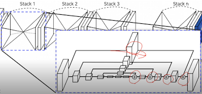 Hourglass network라고 해서 입력 이미지를 통과시켜주면 keypoint heatmap이 나오는 것 같음. 이걸 여러번 중첩할수록 또렷해진다. 그림이 그렇잖아..