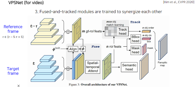 이 UPSNet을 비디오로 확장한 VPSNet 도 있다. pi(init)라는 motion map이 motion map 에 따라서 mapping. 모든 픽셀에 대해서 다음 프레임에서 어디로 가는지 정보를 가지고 있다. 또 전 프레임에서 못봤던 특징이나 전에 있었는데 현재는 없는 특징 등도 관찰해서 더 정확한 detection 가능.