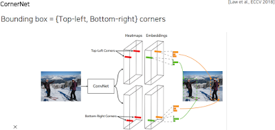 CornerNet은 각 왼쪽위, 오른쪽아래 점들을 추정하게 한 다음 그 점들의 정보를 Embeddings해서 담는다. 영상을 주면 corner point만 잔뜩 추출하고 embedding point는 같은 object에서 나왔다면 같아야 한다 라는 조건을 걸어주고 학습을 함.