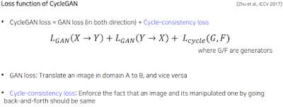그래서 pairwise 아니어도 가능하게 하기 위해 기존 GAN loss에 Cycle-consistency loss가 추가됨. 그럼 이거 어떻게 하느냐. 사실 말이 안되지 않느냐. 그래서 변환하고 원래 입력으로 다시 변환해서 이 둘이 같아야 한다. 이 조건을 만족하면서 변환할 때 discriminator를 속이는 방식으로 하면 결국 이상적인 CycleGAN모델이 만들어짐