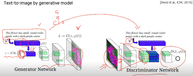 텍스트를 주면 embedding vector로 만들고 앞에 가우시안 랜덤 값을 넣어줌. 하나만 생성하지 말고 비슷한 여러개 생성하라고. 결국 이 문제는 텍스트가 condition이 된 상태에서 이미지를 만들라는게 된다. 이 Generator를 겨처서 이미지 만들고 Discriminator를 거침. 근데 입력문장도 같이 줘서 가짜냐 진짜냐를 학습시킴.