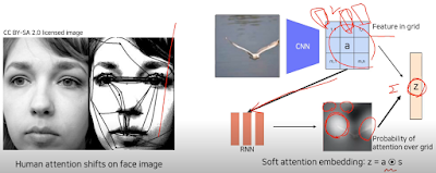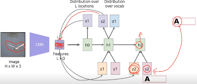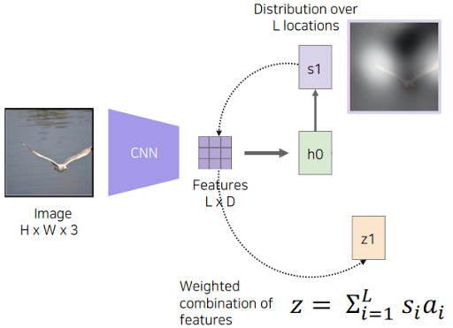 사람도 물체를 보면 전부다 훑어보는게 아니라 주요 특징들을 위주로 본다. 우리가 전 시간에 했던 작업이 이미지를 보면 물체 어디를 보는지 표현하는 heatmap이었는데 이걸 이용한다고 한다. Features in grid 안에 있는 attention들을 probability라고 생각하고 attention엔 각 위치에 집중을 할건지 안할건지가 들어있다고 함. 각 위치를 행렬곱 으로 하고 더해서 평균낸다. 그래서 Z가 나온다.