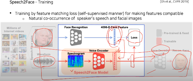 모델 Speech2Face Model의 목적이 소리만 듣고 그 사람의 얼굴을 파악하는 거다. 그래서 소리만 듣고 학습하는 모델을 만드는데 이게 위에서 사용한 VGG-Face Model의 output 과 비슷하도록 둘의 차이를 loss로 만들어 학습시킨다. 이렇게 하면 우리가 만든 모델이 소리만 듣고 VGG-Face Model의 output을 모방하여 나오게 되므로 그대로 Face Decoder에 넣어 얼굴이 나오게 된다.