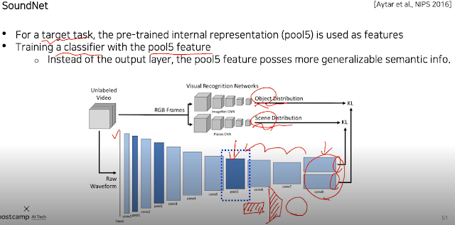 그래서 영상 말고 내가 소리의 특징에 대해서만 따로 연구하고 학습하고 싶다. 고 하면 pool5 쯤에서 따로 떼와 모델 통과시키면서 연구하면 된다. 왜 conv8에서 가져오면 안되냐면 conv8로 갈 때 쯤은 이미 object distribution과 scene distribution쪽으로 weight가 바뀌어 있기 때문에 conv5 쯤이 좀 general 한 곳일 것이다.