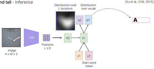 위에서 만든 z1을 RNN의 condition으로 하고 시작단어 y1를 입력으로 넣어준다. condition이 주어졌을 때 뭘 말해야 되나 고민을 한다. 그래서 결과가 나오면 결과 단어랑 다음에 어디를 referencing 할지도 같이 예측해줌. soft attention map으로 어떤부분을 attention 해줘야 하나.