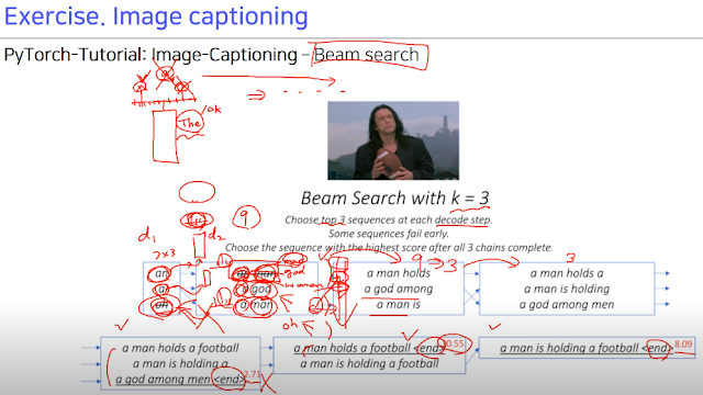 10000개의 단어 중에 어떤 단어를 가져올 거냐. k=3 이라면 처음엔 top 3를 가져온다. 이 각각의 단어 다음의 경우에도 top 3를 검사한다. 그럼 총 9개 가 나오는데 여기서 top 3를 본다. 즉 나머지 6개는 지우고 최종적으로 3개가 나옴. 이걸 반복함. 문장이 끝날 때에는 <end> 토큰 중 제일 점수가 높은걸로.