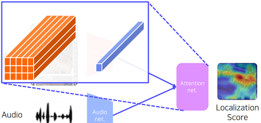 이미지를 보고 이 소리가 어디에서 나는건지 예측하는 모델. 원래 입력 이미지랑 입력 사운드를 준다. 그리고 이미지에서 해당 소리가 나는 곳에 highlight를 해주고 여기에서 소리가 난다고 label을 정해줘서 loss를 정해주고 훈련을 했었다. 이 부분이 Attention net 부분. 보면 해당 물체에 score가 제일 높다. 이건 Visual net에서 나온 weight map에 Audio net에서 나온 weight map을 모든 visual weight map에 선형곱을 해줘서 나온 score 값을 표시하는 것이다. 이걸 사람이 만든 답인 label과 비교해서 학습했다.