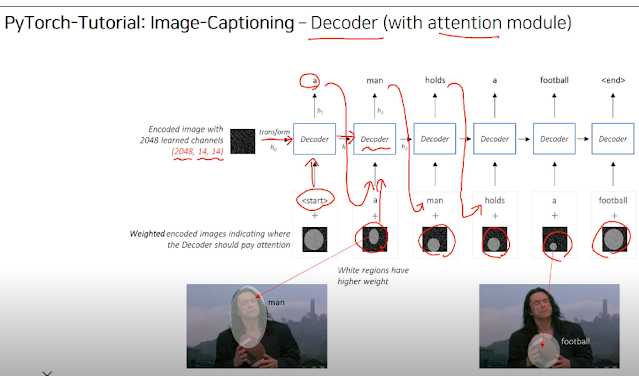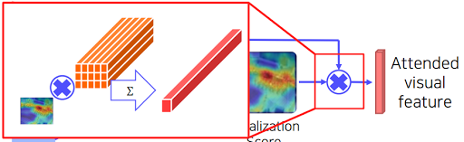 사람도 물체를 보면 전부다 훑어보는게 아니라 주요 특징들을 위주로 본다. 우리가 전 시간에 했던 작업이 이미지를 보면 물체 어디를 보는지 표현하는 heatmap이었는데 이걸 이용한다고 한다. Features in grid 안에 있는 attention들을 probability라고 생각하고 attention엔 각 위치에 집중을 할건지 안할건지가 들어있다고 함. 각 위치를 행렬곱 으로 하고 더해서 평균낸다. 그래서 Z가 나온다.