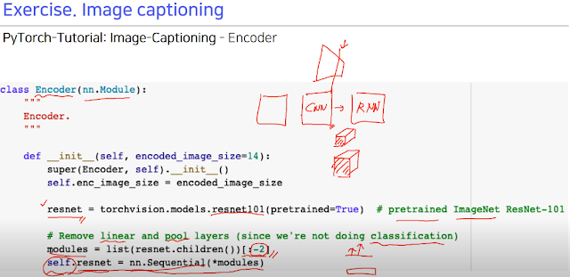 pre-trained 된 resnet101을 쓸건데 마지막 레이어 2개는 class 분류하는 FC이니 잘라내고 마지막 CNN 만 쓰겠다. 이 CNN을 가지고 RNN에 넣어서 문장 만들겠다. 하는게 목적. 그래서 잘라냄.