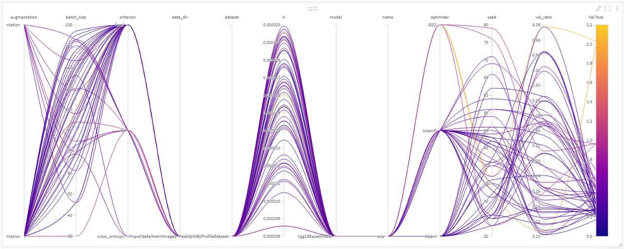 wandb의 sweep 설정시 변수 설정선택이 1개밖에 없을땐 그냥 같이 변수로 넣어서 실행했지만 저렇게 그림에 반영되어서 나올 줄은 몰랐다. 어차피 변인요소가 1개밖에 없을 때도 변인요소로 넣으면 직관적으로 뭘로 설정되어있는지 바로 확인할 순 있지만 보기가 힘들어지니까 따로 value로 설정해서 빼줘야 겠다. 또 random seed나 val_ratio는 굳이 변인으로 설정하지 않아도 되겠다.