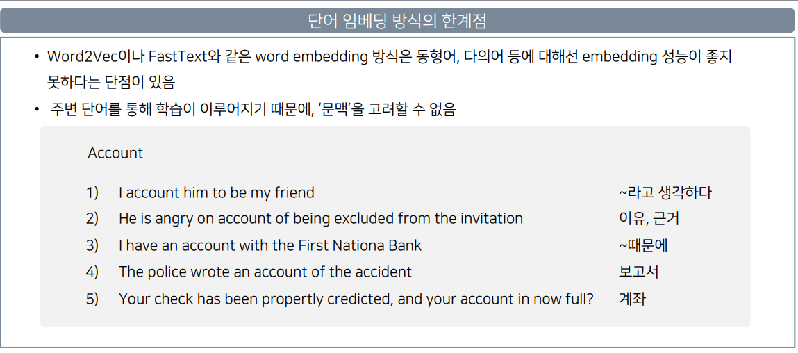하지만 이것도 완전한 문장을 주면 그 문장 안에서 단어의 뜻을 유추 못하는 문제가 생김. 이게 무슨말이냐면 같은 단어도 다른 문장에 따라 완전히 다른 뜻으로 해석해야 하는데, 같은 단어도 다른 여러 문장들로 학습하다보니 뜻이 모호해지고 제대로 해석을 못하는 경우가 생긴다. 그래서 언어 모델이 생겼다. RNN이나 transformer 같은거.
