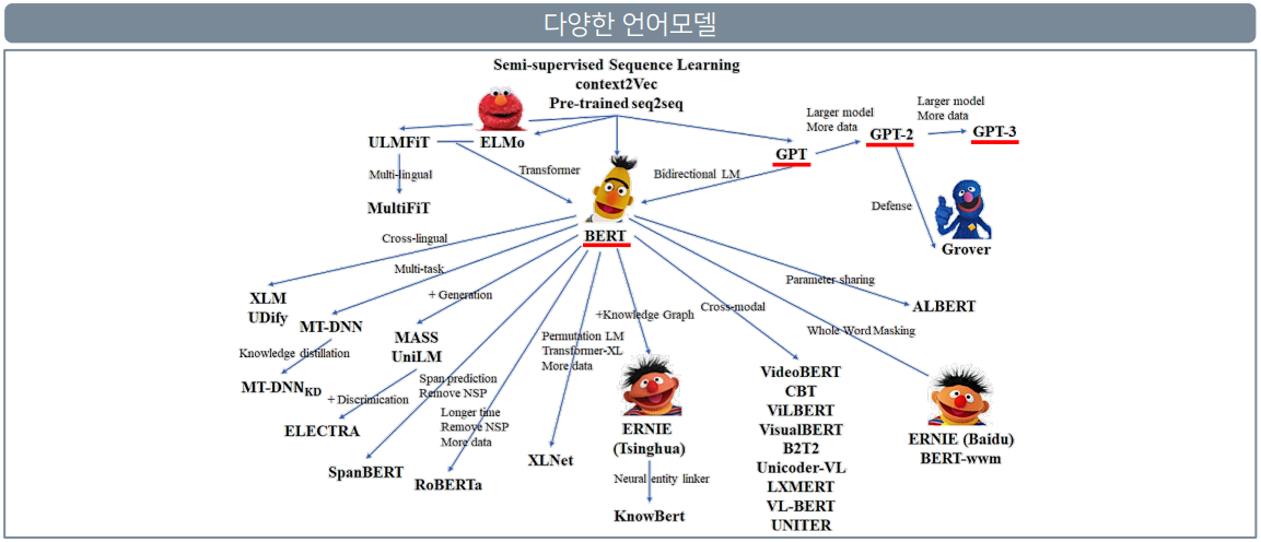 앞에 단어가 들어온 순서대로 입력받고 출력받아 그걸 입력으로 받는 시계열 방식의 RNN이 생겨나 많은 인기를 얻고, 중요한 정도에 따라 정보를 받아들이는 attention, 이렇게 rnn기반에 attention을 넣어 만들어진 attention모델에서 차례대로 입력받으니 속도가 너무 느려서 한번에 받도록 만든 transformer. 이렇게 만들어진 transformer가 성능이 너무 좋아서 이를 기반으로 만들어진 다양한 transformer 파생작들. 원래의 transformer를 기반으로 만들어진 BERT를 시작으로 다양한 파생작들..