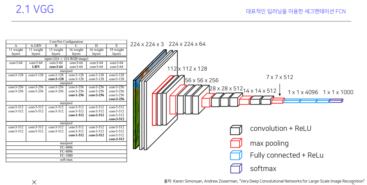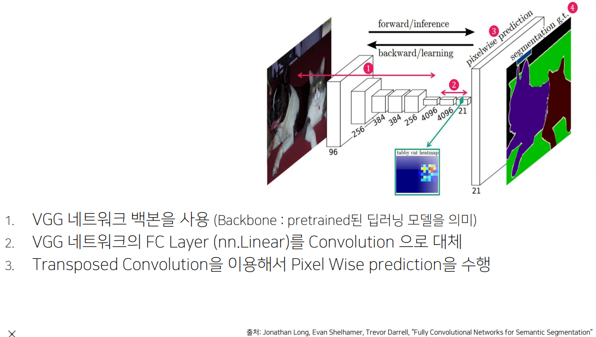 미리 학습된 VGG가지고 만듬. fc layer쓰면 이미지 위치정보를 손실하는데 아얘 fc를 없애고 모두 conv로만 쓰고, 작아진 conv image를 deconv 혹은 transposed conv로 복원.