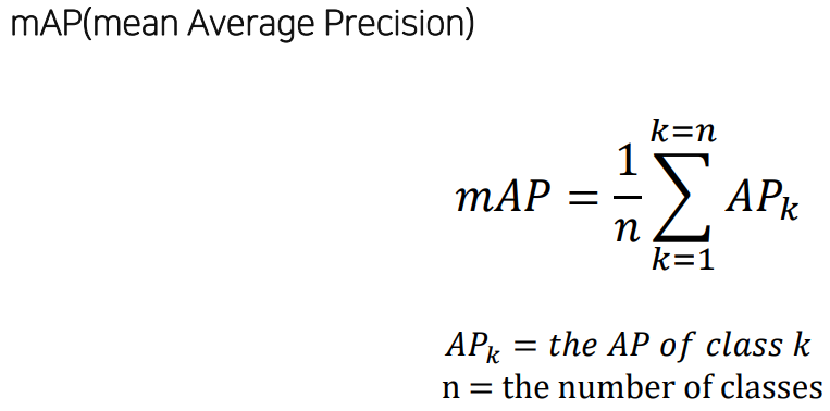 근데 이게 하나의 클래스인 경우도 다른 클래스인 경우도 있을테니까 모든 클래스의 AP에 대해서 평균 낸게 mAP