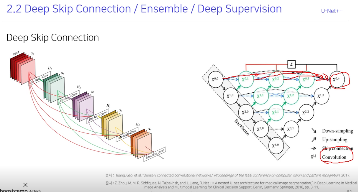 그냥 싹다 연결해준다. 같은 레벨은 이전것들까지 모두 concat으로 skip connection해주고 다른 level은 scale sampling을 해줘서 맞춰준다. 이렇게 하니까 level 1, 2, 3, 4간에 앙상블하는 효과도 생기고 성능도 그냥 U-Net에서 따로 해서 더하는 항상블보다도 향상. loss도 Deep Supervision이라는 신기한 loss를 쓴다.