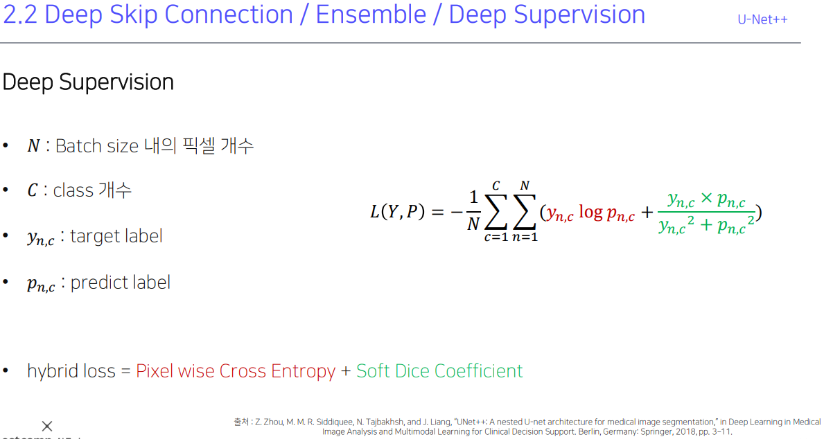 Full-scale Deep Supervision (loss function)은 성능 잘 나온 3가지 loss function들을 결합한거. Focal Loss : 클래스의 불균형 해소, ms-ssim Loss : Boundary 인식 강화, IoU : 픽셀의 분류 정확도를 상승.