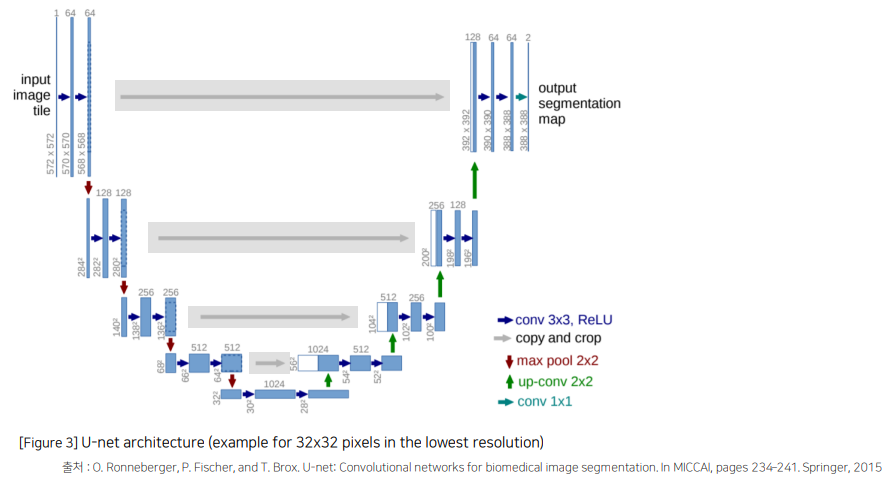 같은 계층(level) 의 Encoder 출력물과 Up-Conv의 결과를 concat으로 붙여주는 것이 특징이다. 또 down sampling할 때 padding을 안줘서 이미지 사이즈가 계속 감소해서 encoder와 decoder가 같은 level이라도 사이즈가 달라지는 문제는 그냥 crop으로 해결함.