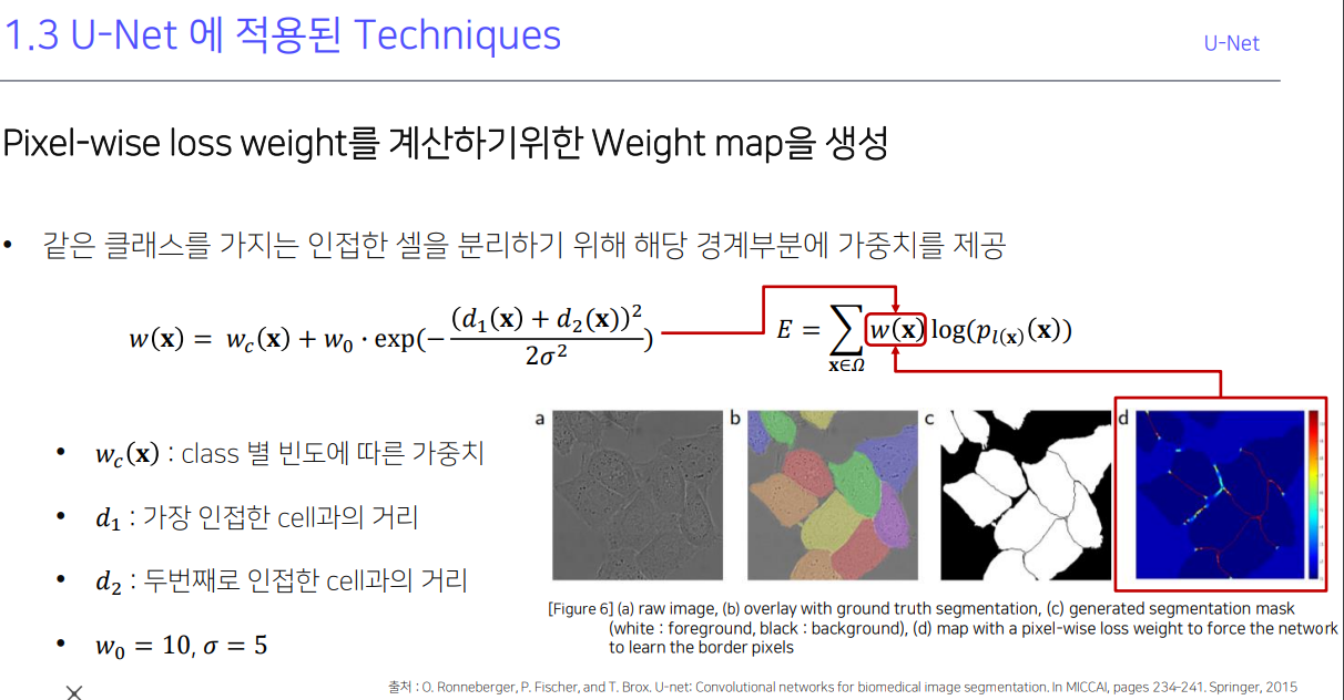 U-Net에 적용된 다른 Techniques들은 물체를 뭉게지게 하는 Random Elastic deformations을 통한 Augmentation, 겹치는 부분이 없게 한 Sliding Window가 있다. 또 신박했던게 인접부분을 분리하기 위해 거리에 다른 loss 가충치를 만든 부분인듯.