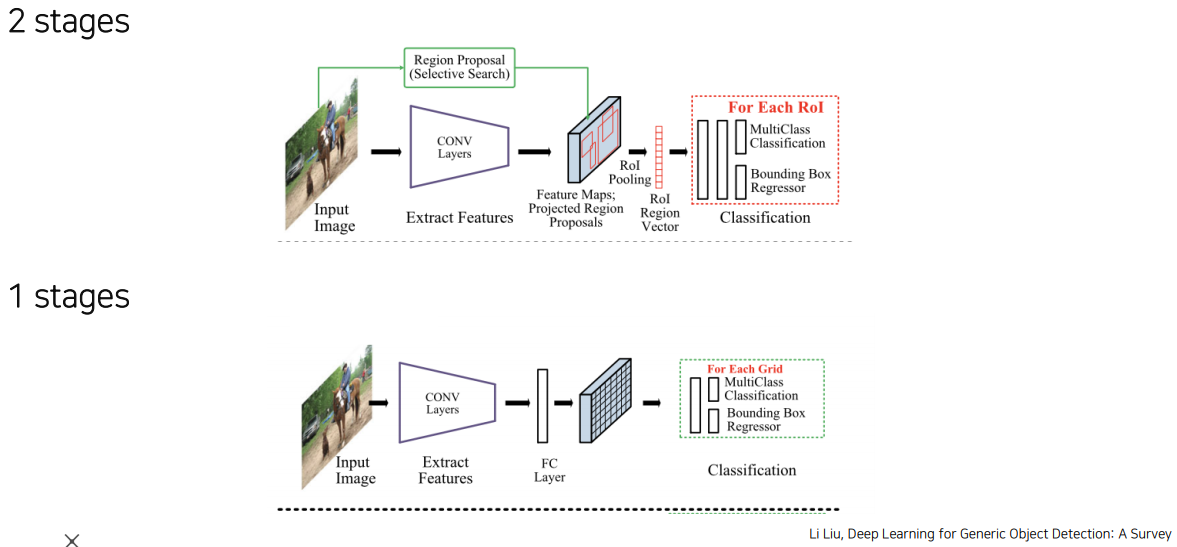 초기에는 물체의 위치를 RoI로 찾고, 그 그림 위치에 대한 Classification을 진행한 2 stages가 있었고 나중엔 1 stages로 모두 한번에 끝내는 방법이 개발됨.