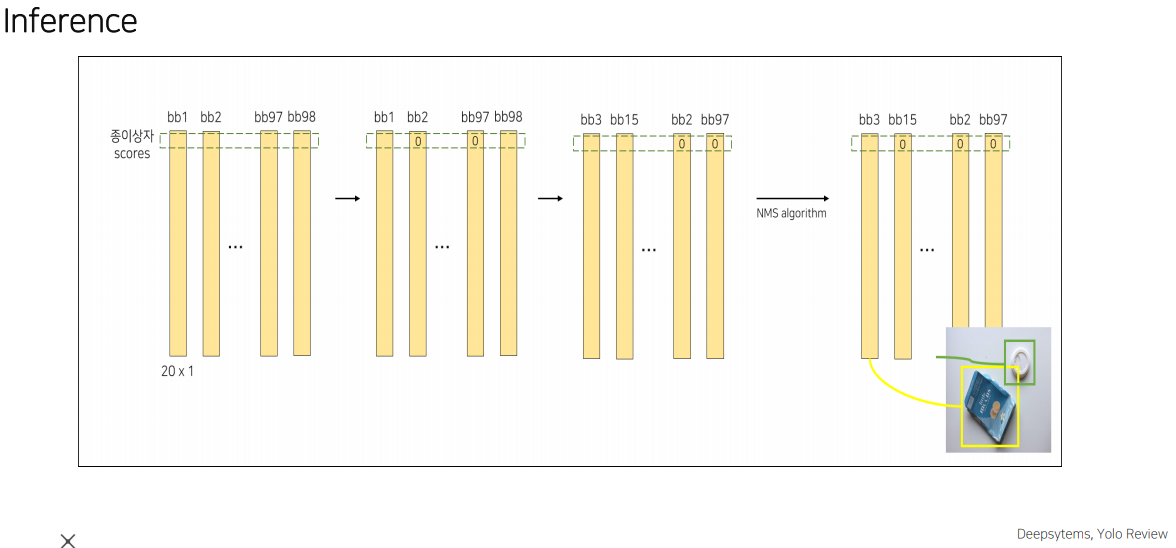 그래서 loss 보면 각 box에 물체가 들어있냐 마느냐도 들어있음. 중복되는 영역은 NMS를 이용해 제거함.