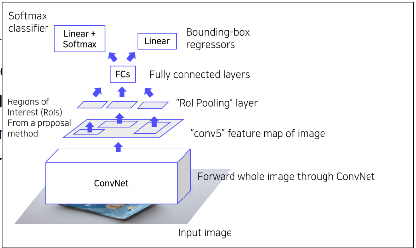 Fast RCNN. 그냥 한번에 CNN에 다 넣고 RoI 구해서 그 부분에 대한 classification을 한다고 함.