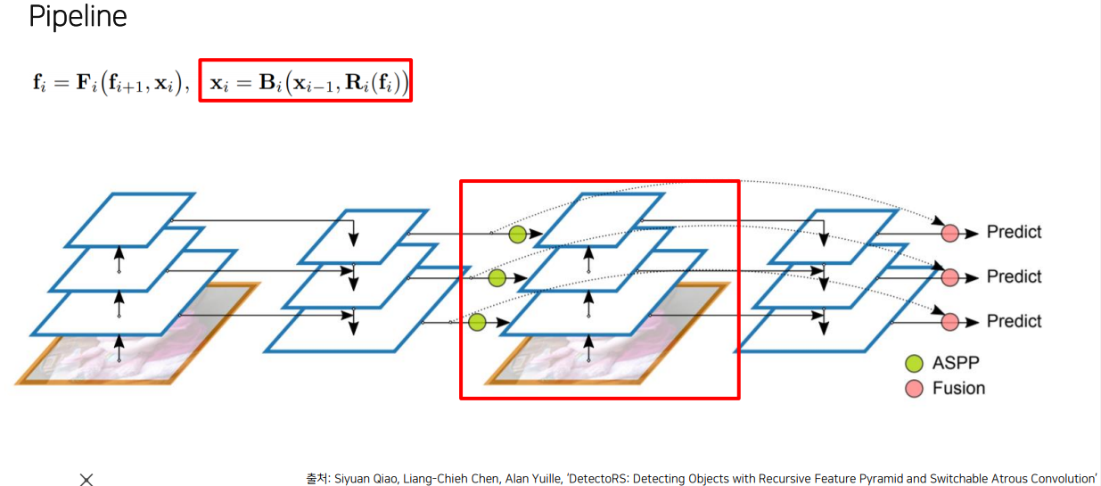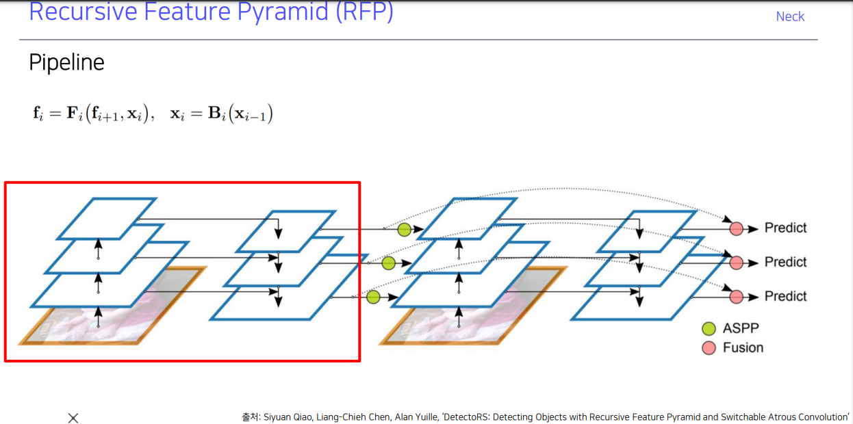 RFP(Recursive Feature Pyramid)는 bottom-up, top-down 해서 나온 결과를 다시 bottom-up에 넣고.. 를 반복하다보면 더 좋아지지 않을까 하는 발상. 다시 넣어줄 땐 weight를 설정할 수 있도록 ASPP를 설정함. 그냥 일반 입력값에 RFP Features가 추가된다고 보면 된다.
