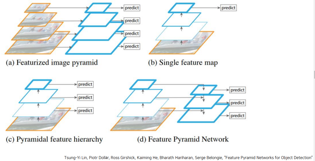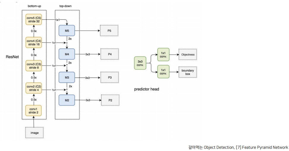 FPN( Feature Pyramid Networks) 의 경우 bottom-up하면서 중간 중간의 cnn들의 정보를 top-dwon을 수행하며 집어넣고 있음. 즉 bottom에서 얕은 cnn은 작은 물체에 대한 정보도 가지고 있으니까 이걸 활용하고 싶어서 top-down을 만들어 넣는다.