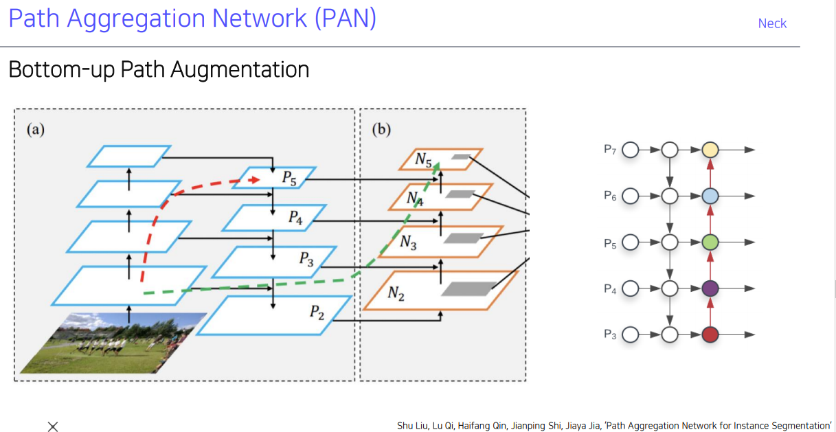 반면 PAN(Path Aggregation Network) 같은 경우 FPN에 문제가 있다고 들먹이며 마지막 cnn에선 작은 정보가 없다고 예측 결과를 얇은 층의 cnn에 다시 넣는다. 4장밖에 안된다고 함.