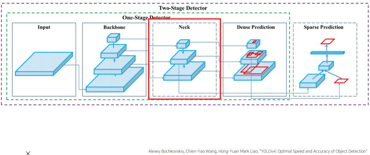 cnn을 너무 많이 거치면 큰 물체는 감지 잘하지만 detail한 작은 물체들은 잘 감지 못하는 문제가 발생해서 중간과정을 하나 만든거고, 이 Neck에 대해서도 여러 모델 방법론들이 있음. 우린 여기서 FPN, PANet, RFP, ASPP, BiFPN 에 대해 살펴볼거다.