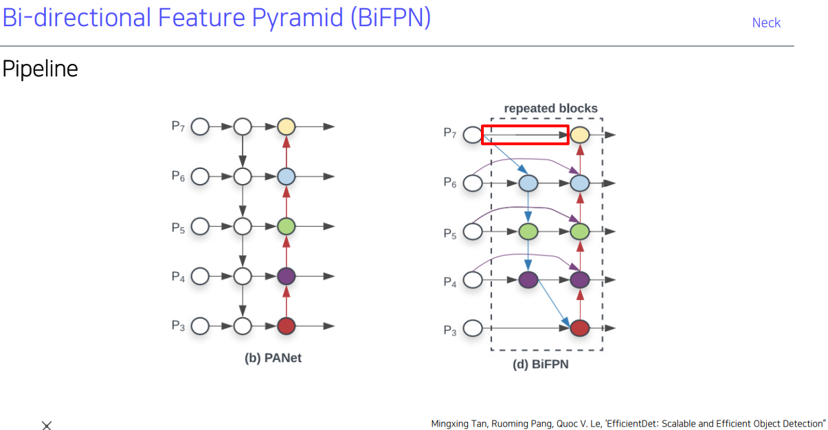BiFPN(Bi-directional Feature Pyramid)의 경우 PAN을 쓰지만 좀 더 최적화 시켜보자는 의미에서 몇가지 안중요할 만한 feature는 없애고, 반복한다.