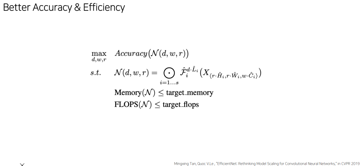 efficientnet의 모토는 어차피 사이즈 키우면 성능이 늘어나니까 얘를 좀 더 효율적으로 늘릴 순 없을까? 하는거.