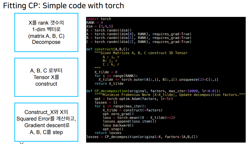 CP는 Tucker의 특별한 case이다. CP는 eigen value로 분해해서 만들지만 Tucker는 core tensor를 만들어서 rank를 줄이는 방식으로 함.