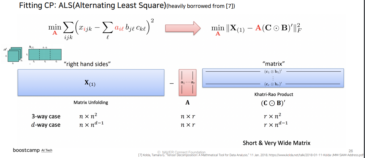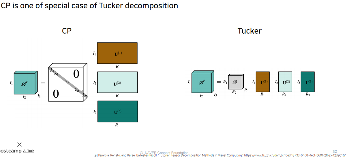 CP는 Tucker의 특별한 case이다. CP는 eigen value로 분해해서 만들지만 Tucker는 core tensor를 만들어서 rank를 줄이는 방식으로 함.