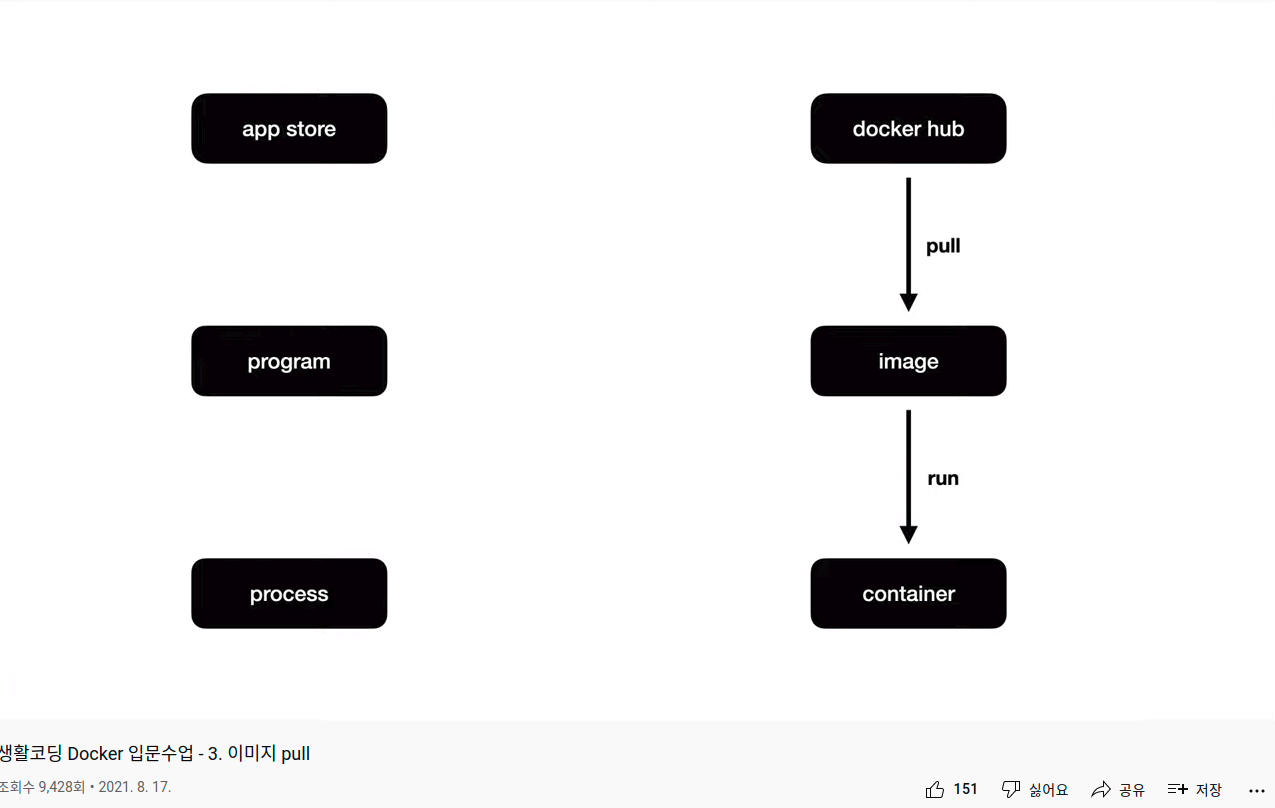 허브에서 받아라. image는 iso 같은거고 허브에서 pull로 받음. 그걸 설치해서 실행하는게 run.