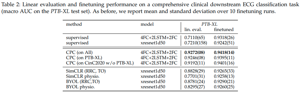 - 10초 길이의 ECG로 CPC model을 pretrain. 나머지 다른 모델들은 2.5초로 train.