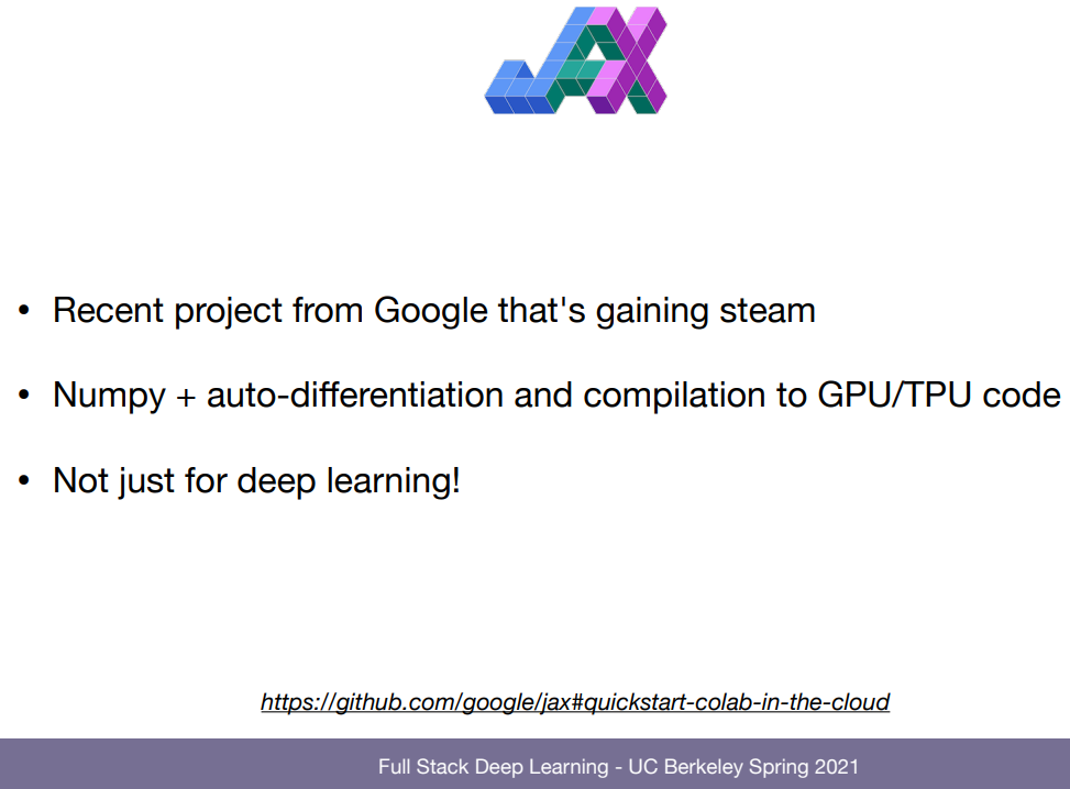 그 다음에 JAX를 좀 강조하던데 tensorflow나 pytorch에 있는 모든 레이어가 있는건 아니지만 auto-diff와 GPU/TPU를 편하게 다루는것을 목적으로, 실용성, 범용성에 목적을 두고 만들어짐. 그래서 꼭 딥러닝으로만 쓸려는게 아니다.