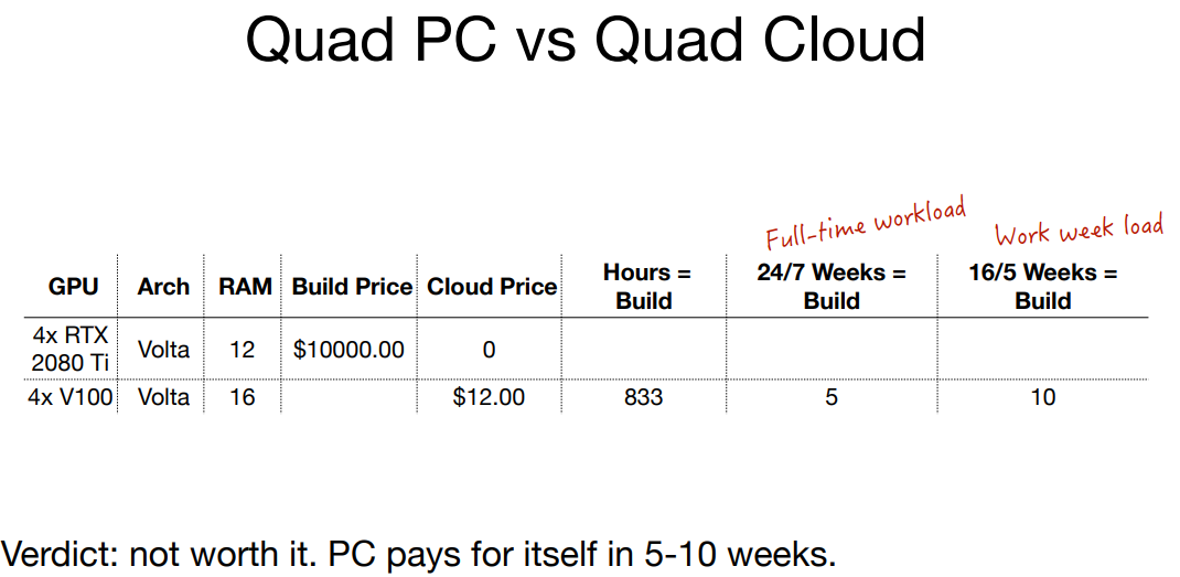 클라우드를 돌리는 상황과 비교하면 어차피 클라우드는 1시간에 1.2만원 정도하니 그걸 24시간 5주동안 돌리면 어차피 천만원 나옴. 그럴바엔 로컬로 사는게 낫다는 결론. 그래서 고려대상임. 물론 채굴애들때매 구하기 어려운점도 고려해야 한다.