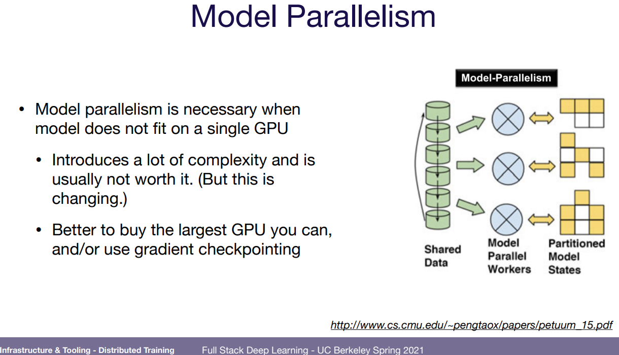 모델을 쪼개는 모델 병렬.. 의도는 모델이 하나의 GPU에 들어가기에 너무 크다면 나누는 거지만 너무 까다롭고 힘들기 때문에 걍 VRAM이 더 큰 GPU 하나 사던가 해서 피할 수 있으면 피하라고 추천함..