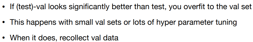 test-val이 test보다 매우 좋을 경우, 이젠 test-val에 overfitting 된거다. val data가 적거나 하이퍼 파라미터를 너무 조정한 경우. 걍 val을 더 추가하거나, 바꾸거나, 실제 test를 꾸준히 제출하는 등으로 막을 수 있음.