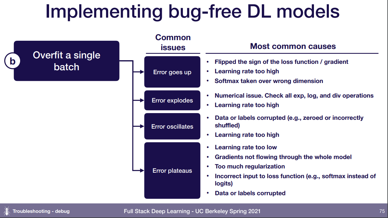 결론은 ML이 디버깅이 어려운 이유가 정말 많은 요소들을 한번에 사용하기 때문이다. 그래서 이러한 테크닉들이 등장한 것이고, 여기서 제시한 건 할 수 있는한 최대한 간단한 것 부터 시작한 다음 천천히 복잡도를 키워나가서 생기는 문제들을 쉽게 발견하고 분리시키도록 한다.
