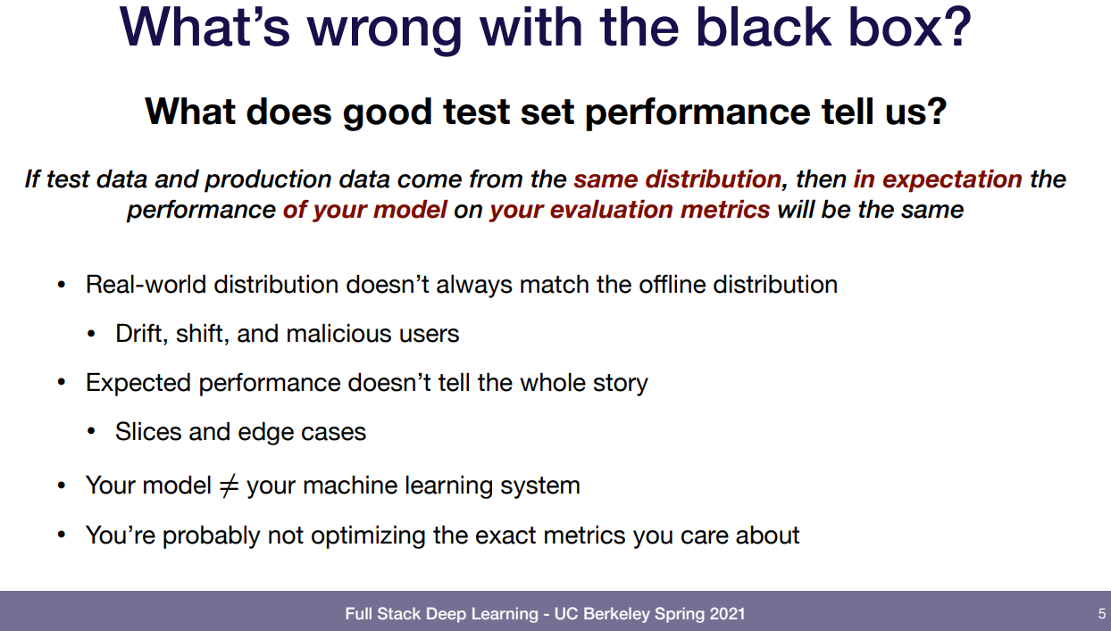 우리가 모델을 잘 만들었다고 해도 소비자는 그걸 정말로 믿을 수 있을지 걱정됨. 우리가 훈련한 데이터 분포가 실전의 데이터 분포와 같을수록 믿을 수 있다고 할 수 있다. 또 극단적인 경우도 안될 수 있고, 우리가 하려는건 모델을 만드는게 아닌 모델 시스템을 만드는거라 모델 만들때 신경 안써도 되었던걸 하느라고 문제 생길 수 있음.