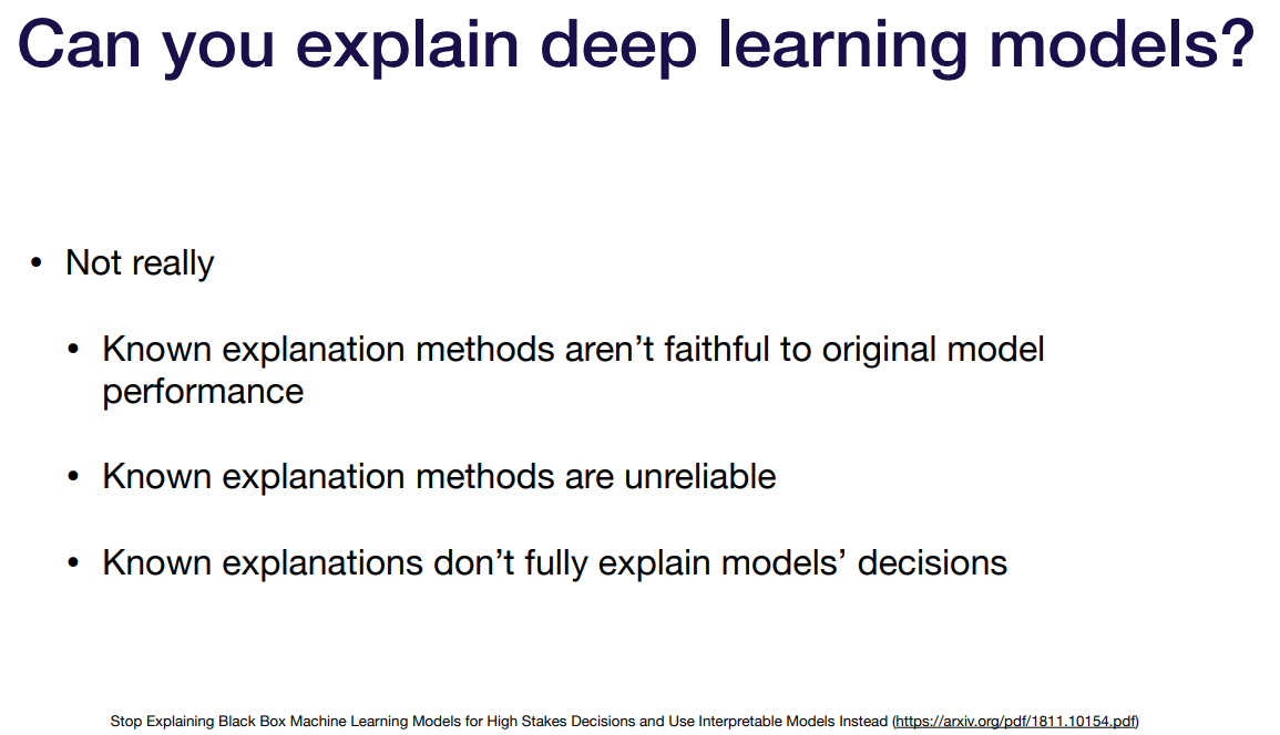 근데 애초에 모델을 설명한다는게 가능한가? 전문가들은 별로라고 함. 위에서 설명했던 방법들이 실제 모델과 연관이 없을 수도 있고, 불안하고, 모두 설명을 못해준다. 이렇게 줄줄히 설명했는데도 걍 참고용으로만 써야 하는 듯 하다.