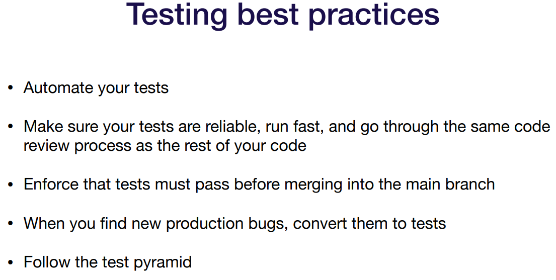 test pyramid가 뭐냐면 unit test를 제일 많이, integration이 중간, end to end가 제일 적게 하는거다. end to end가 실제 사용자 입력, 출력 결과인데 왜 적냐 하지만 unit test는 빠르고, 뭐가 잘못되면 그 하나가 제일 잘못될 확률이 커서 각자 독립적이어서 디버그 후보를 줄일 수 있다는데 있음. 물론 end to end도 중요하긴 하지만 어쨋든 저렇다.