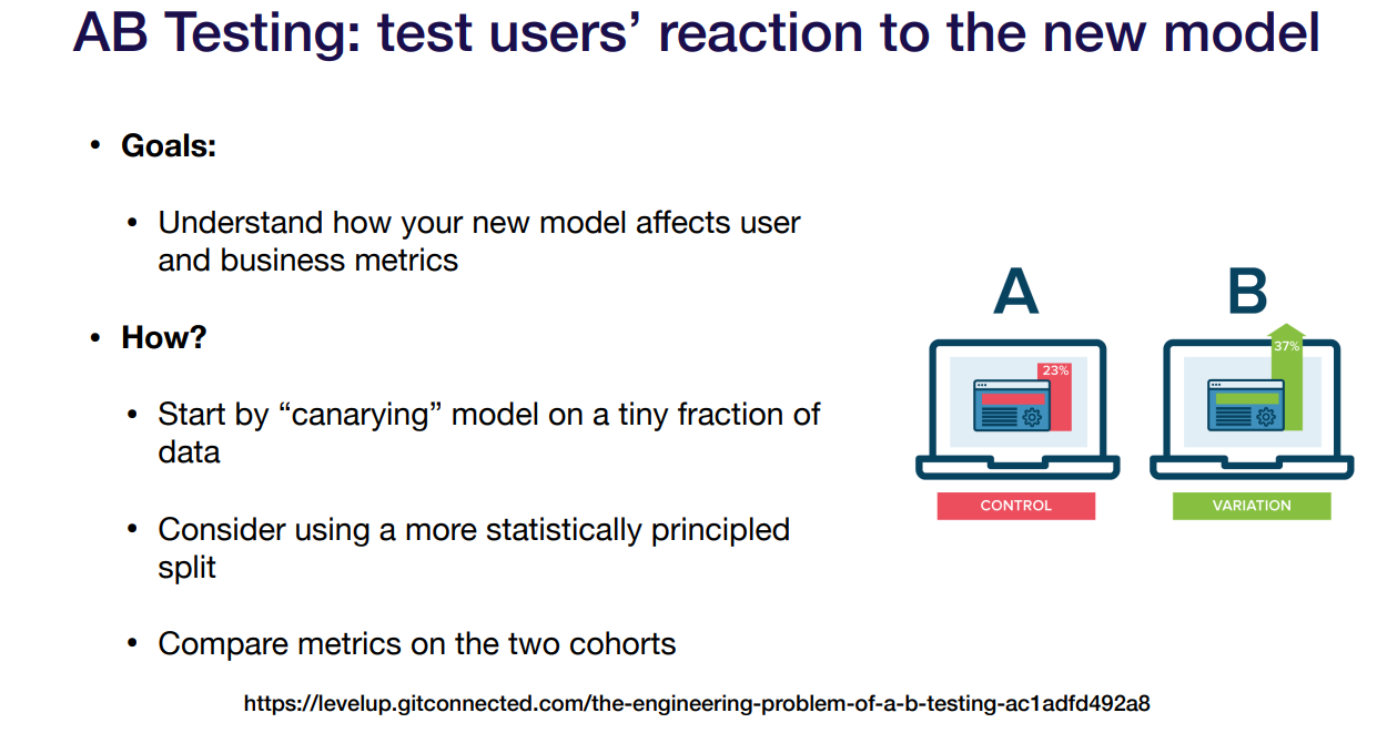 아까 했던 shadow test는 오프라인 모델이 실제 온라인 모델로 바꿨을 때의 차이를 봤다면 AB 테스트는 유저 행동에 내가 만든 시스템이 어떻게 반응하는지 하는 테스트. 일부 유저로 하는 카나리 테스트 하거나 통계 쓰셈.