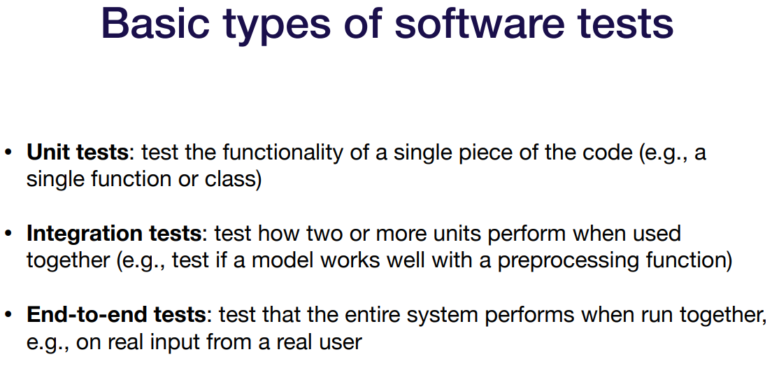 대표적인 테스트들인듯. unit test는 코드 한줄 한줄에 대해 제대로 동작하는지, integration test는 코드 한줄씩만 보고 하다가 좀 뭉탱이로 하면 에러뜰 수 있으니 하는거고, end-to-end는 진짜 처음부터 끝까지 실제의 입력과 출력을 보는 것. 이거 외에 다른것도 많긴 하지만 여기까지.