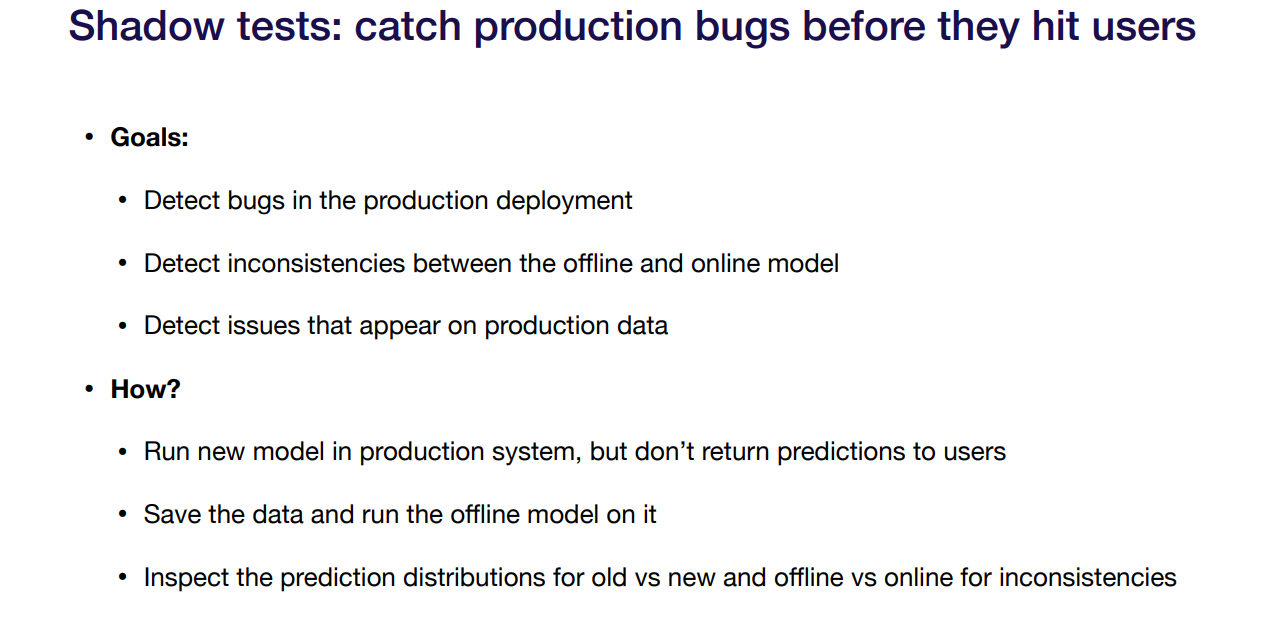 어떻게 하냐면 계속 새로운 모델을 개선하지만 새로운 모델과 기존에 잘 되던 모델 두개를 병렬로 돌려서 잘 되던 모델 결과를 유저한테 주고 새 모델 결과를 보며 개선하는 거다. 또 오프라인으로도 돌려보고 하면서 모순점 찾아 해결하는 것.