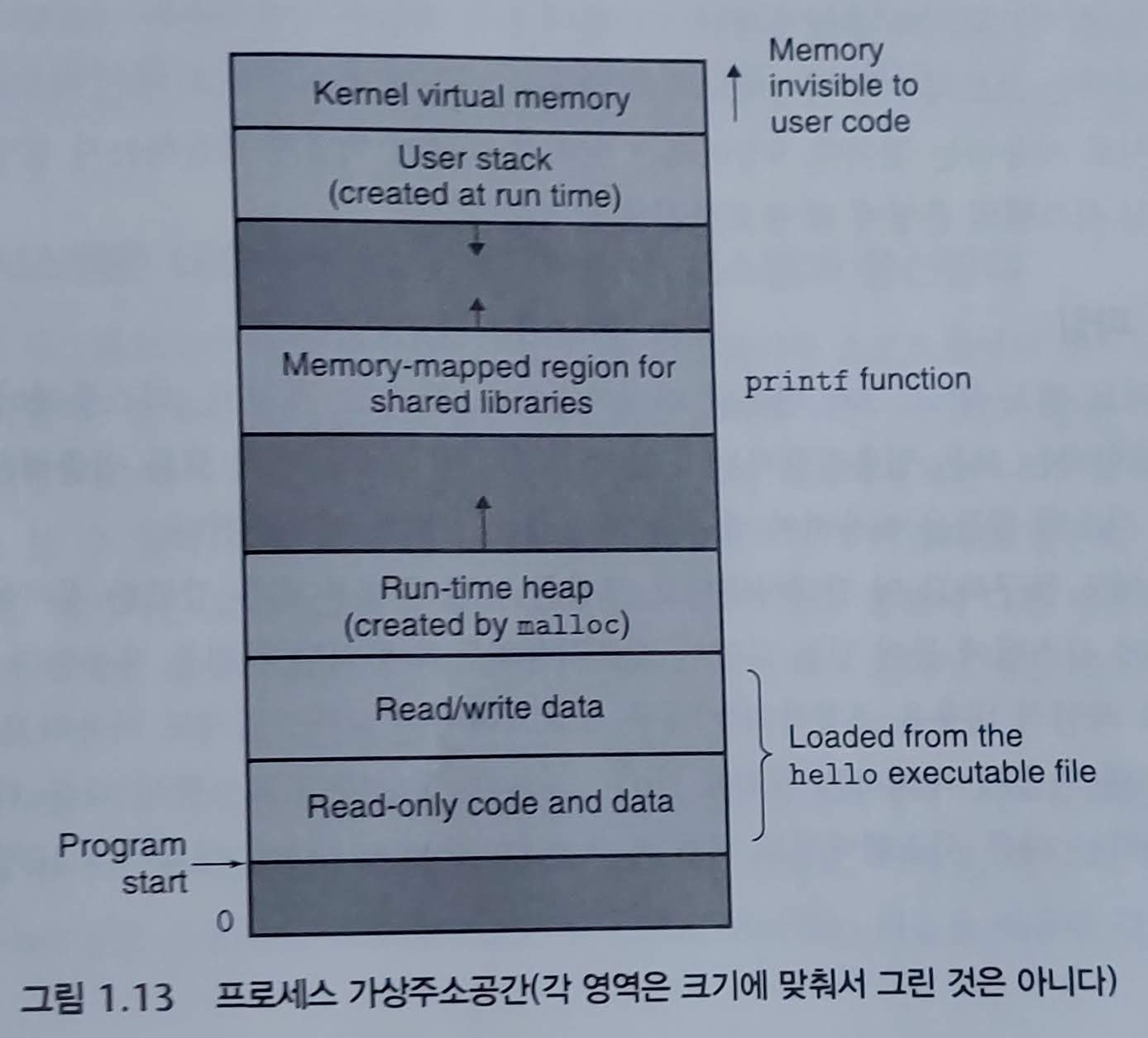 다 입력한 뒤 엔터를 누르면 이제 입력이 끝났다는걸 shell(쉘)이 인지하여 파일 내의 코드와 데이터를 복사하는 명령을 실행하여 실행파일 hello를 디스크에서 메모리로 로딩한다. 데이터 부분은 최종적으로 출력되는 문자 스트링인"hello, world\n"을 포함한다. 직접 메모리 접근(DMA)라고 알려진 기법을 이용해서 데이터는 프로세서를 거치지 않고 디스크에서 메모리로 직접 이동한다.